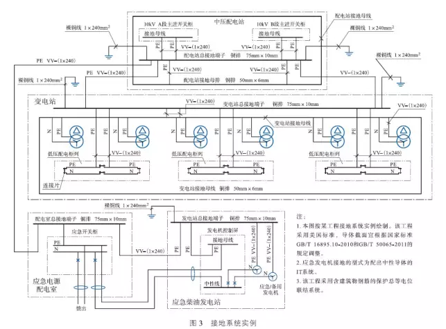 圖中示出保護接地導體和中性導體功能接地是一點連接。對總接地母線、總接地端子、相互連接導體截面的選擇作出了說明。圖中按IEC 60364 - 5 - 54:2011《Low-voltage electrical installations — Part 5 - 54:Selection and erection of electricalequipment — Earthingarrangements and protective conductors》注出總接地母線、總接地端子。