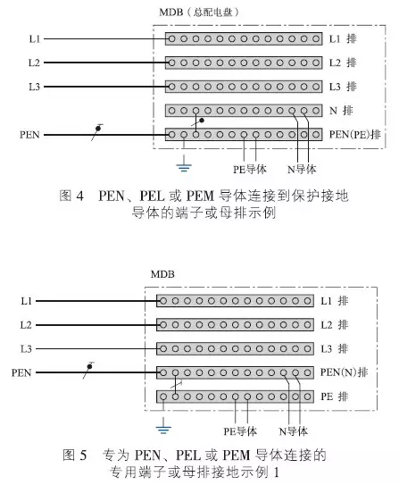 圖4 ~ 圖6分別是GB 16895. 3 - 201 × / IEC 60364 - 5 - 54:2011中PEN、PEL或PEM導體連接到保護接地導體的端子或母排上示例(原圖54. 1a)和專為PEN、PEL或PEM導體連接的專用端子或母排接地示例1(原圖54. 1b)、示例2(原圖54. 1c)。