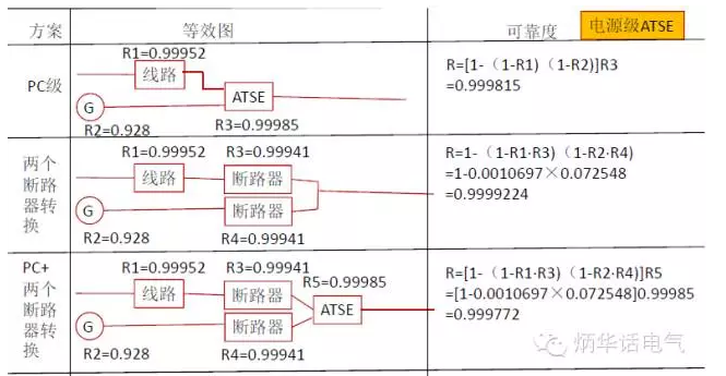 方案1為市電與發(fā)電機(jī)直接通過PC級的ATSE轉(zhuǎn)換,經(jīng)計算,其系統(tǒng)的可靠性R=0.999815,各部件的R值見表2所示,數(shù)據(jù)取自或參考2011年電監(jiān)會年報。其實(shí)方案1是不成立的,兩個電源在ATSE之前需要保護(hù),這樣就變成了方案3。