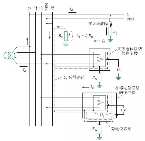 此Uf沿TN系統PE線傳導至各住宅樓用電設備金屬外殼上,如圖中虛線所示,成為持續的轉移故障電壓,引起樓內麻電和電擊事故。