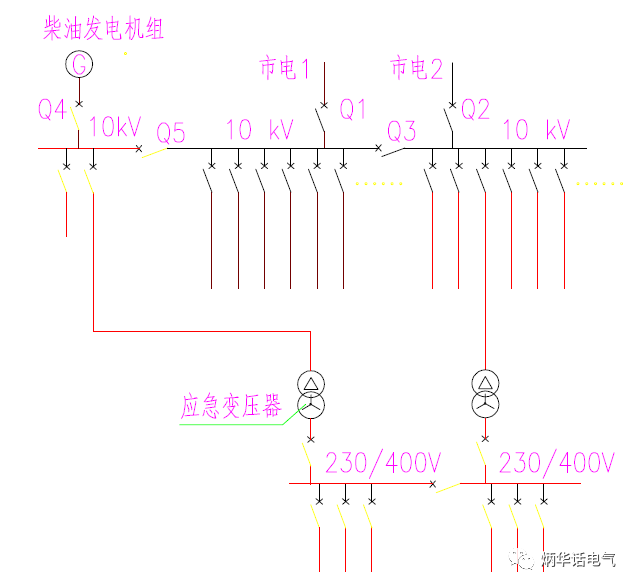 正常時,兩個市電同時工作,Q3斷開。Q5閉合,由市電1帶應急變壓器。應急情況下,市電1和2均斷電,柴油發電機組啟動并投入運行,Q4閉合,Q5斷開與市電脫鉤,由發電機組向應急變壓器供電。