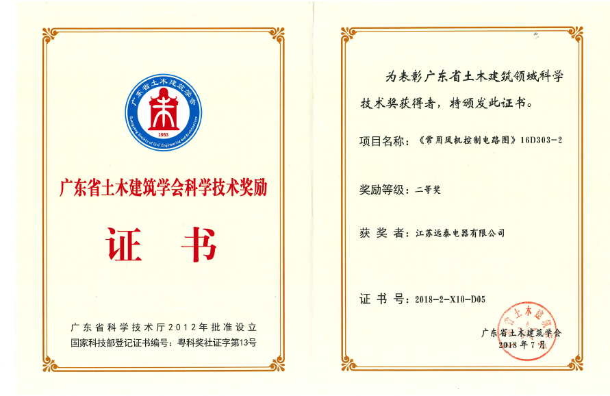 江蘇遠泰電器榮獲廣東省土木建筑學會科學技術獎勵